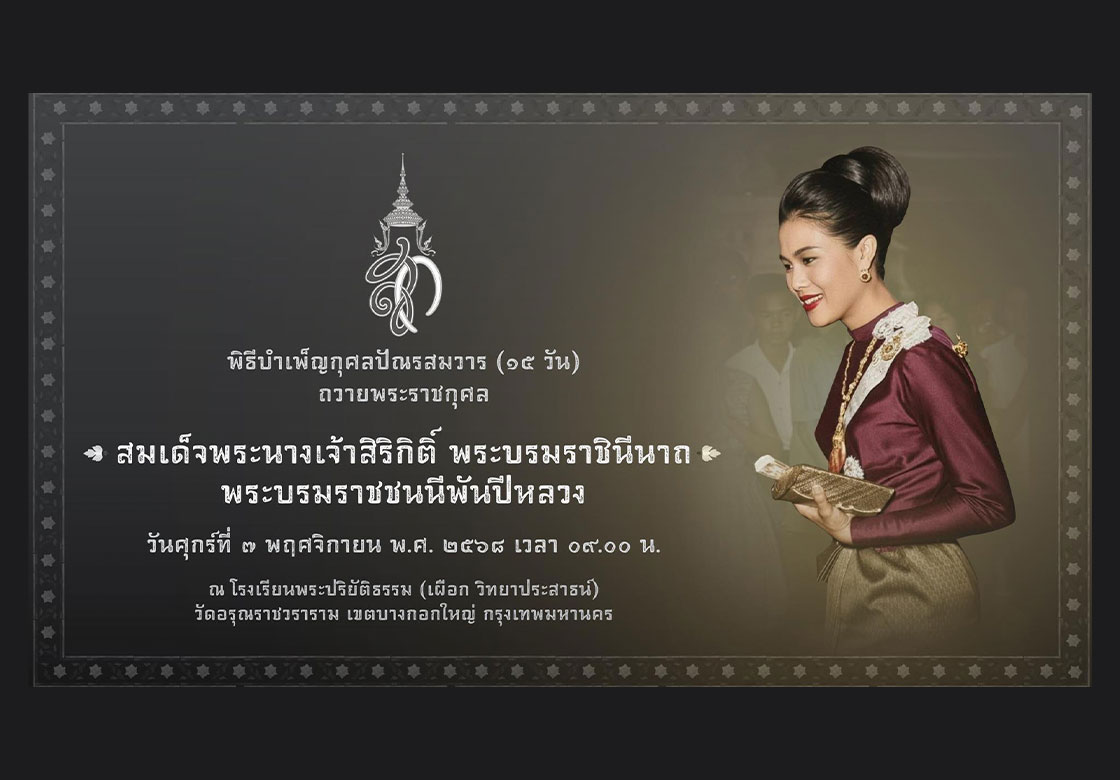กำหนดการ พิธีบำเพ็ญกุศลปัณรสมวาร (๑๕ วัน) ถวายพระราชกุศล “สมเด็จพระนางเจ้าสิริกิติ์ พระบรมราชินีนาถ พระบรมราชชนนีพันปีหลวง” วันศุกร์ที่ ๗ พฤศจิกายน พ.ศ. ๒๕๖๘ เวลา ๐๙.๐๐ น. ณ โรงเรียนพระปริยัติธรรม (เผือก วิทยาประสาธน์) วัดอรุณราชวราราม เขตบางกอกใหญ่ กรุงเทพมหานคร