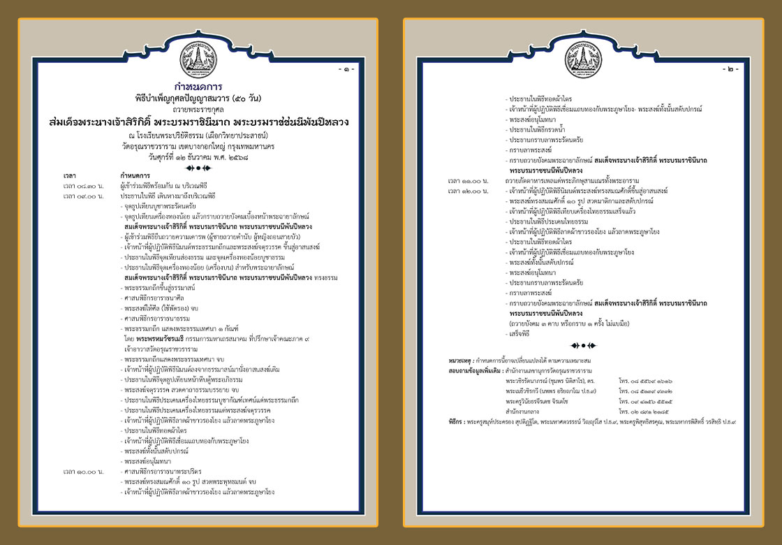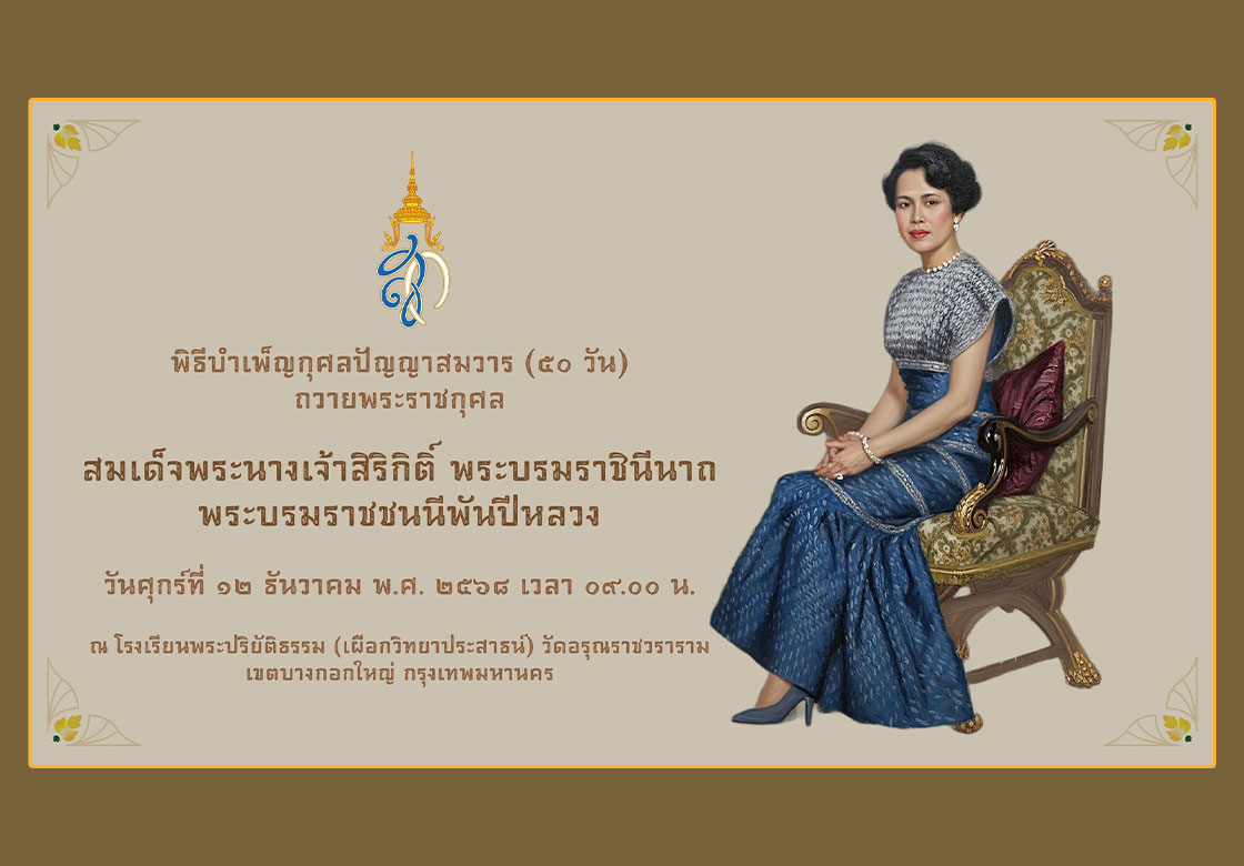 กำหนดการพิธีบำเพ็ญกุศลปัญญาสมวาร (๕๐ วัน) ถวายพระราชกุศล สมเด็จพระนางเจ้าสิริกิติ์ พระบรมราชินีนาถ พระบรมราชชนนีพันปีหลวง ณ โรงเรียนพระปริยัติธรรม (เผือกวิทยาประสาธน์) วัดอรุณราชวราราม เขตบางกอกใหญ่ กรุงเทพมหานคร วันศุกร์ที่ ๑๒ ธันวาคม พ.ศ. ๒๕๖๘