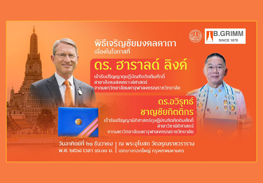 วันอาทิตย์ที่ ๒๑ ธันวาคม พ.ศ. ๒๕๖๘ เวลา ๑๖.๐๐ น. พระเดชพระคุณ พระพรหมวัชรเมธี กรรมการมหาเถรสมาคม ที่ปรึกษาเจ้าคณะภาค ๙ เจ้าอาวาสวัดอรุณราชวราราม เมตตาเป็นประธานในพิธีเจริญชัยมงคลคาถา เนื่องในโอกาสที่ “ดร. ฮาราลด์ ลิงค์” เข้ารับปริญญาดุษฎีบัณฑิตกิตติมศักดิ์ สาขาสังคมสงเคราะห์ศาสตร์ จากมหาวิทยาลัยมหาจุฬาลงกรณราชวิทยาลัย และ “ดร.อวิรุทธ์ ชาญชัยกิตติกร” เข้ารับปริญญานิติศาสตรดุษฎีบัณฑิตกิตติมศักดิ์ สาขาวิชานิติศาสตร์ จากมหาวิทยาลัยมหาจุฬาลงกรณราชวิทยาลัย