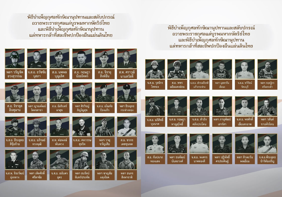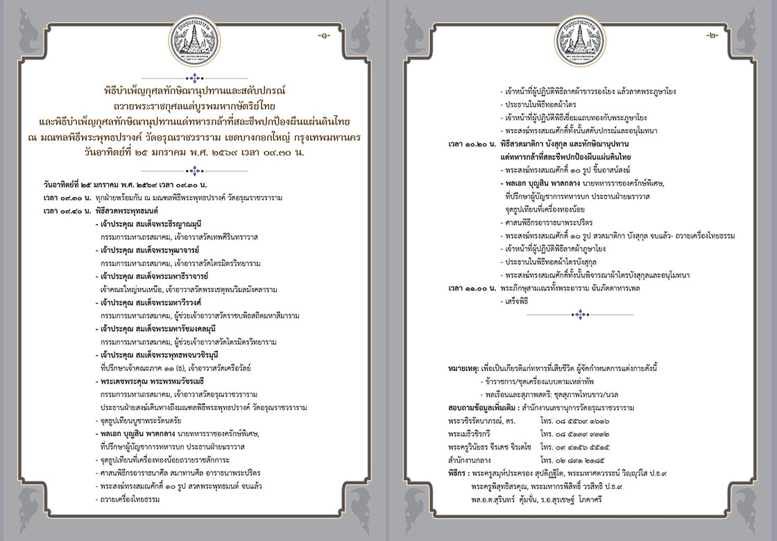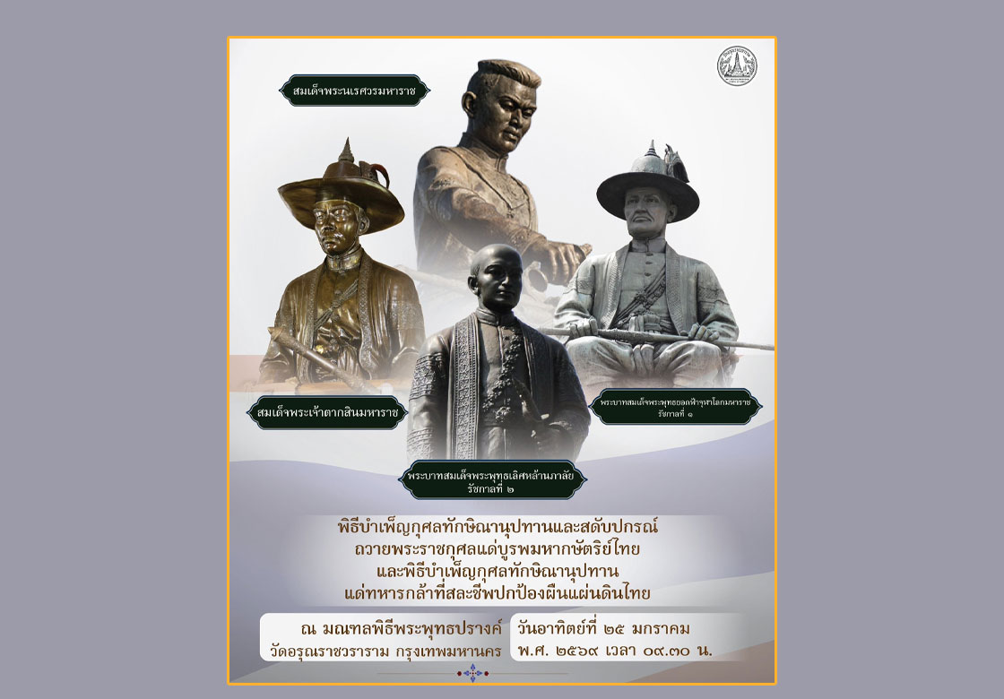 ขอเชิญร่วมพิธีบำเพ็ญกุศลทักษิณานุปทานและสดับปกรณ์ ถวายพระราชกุศลแด่บูรพมหากษัตริย์ไทย และพิธีบำเพ็ญกุศลทักษิณานุปทานแด่ทหารกล้าที่สละชีพปกป้องผืนแผ่นดินไทย