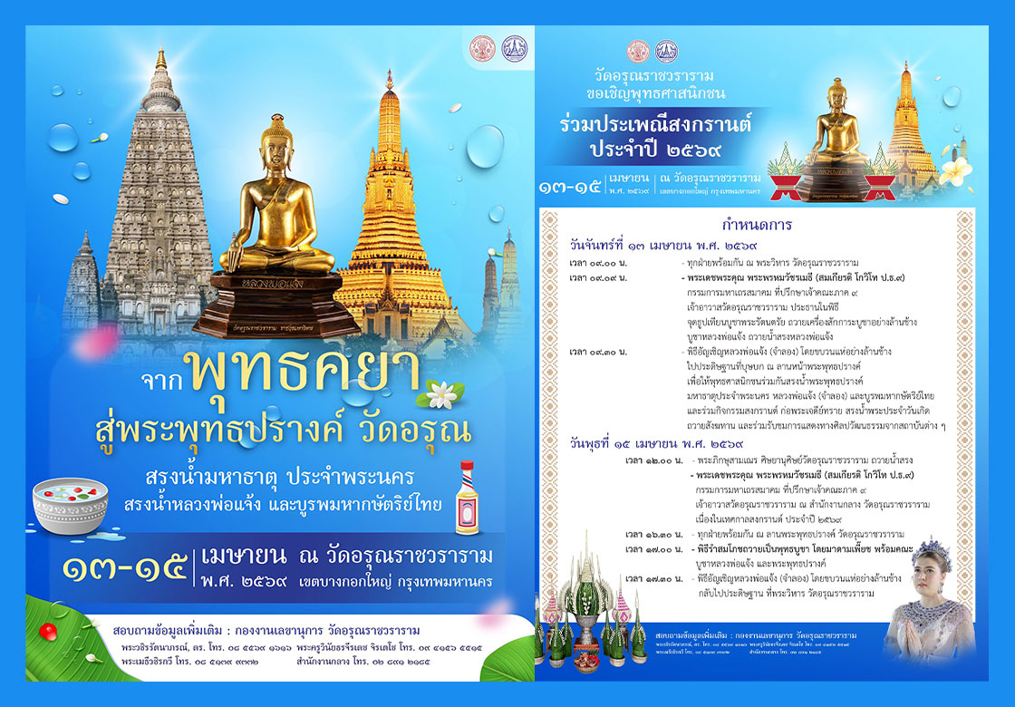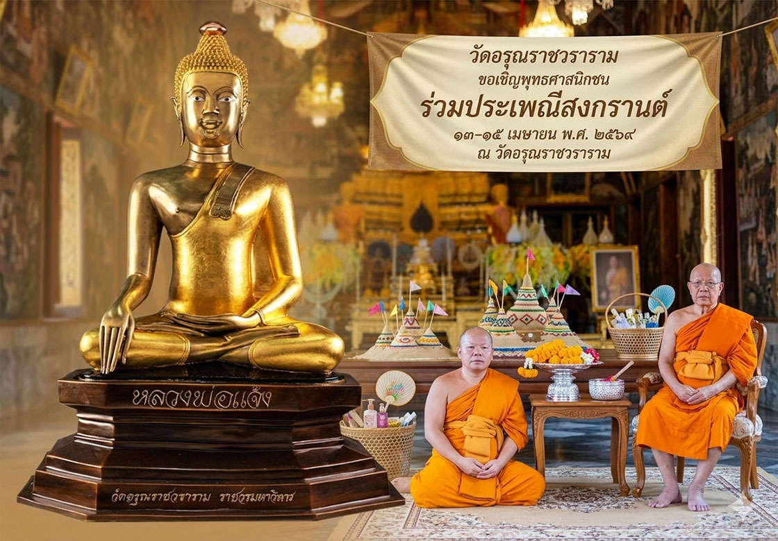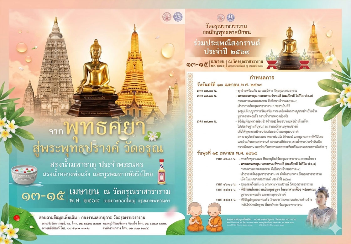 ขอเชิญพุทธศาสนิกชน ร่วมประเพณีสงกรานต์ ๑๓-๑๕ เมษายน พ.ศ. ๒๕๖๙ ณ วัดอรุณราชวราราม